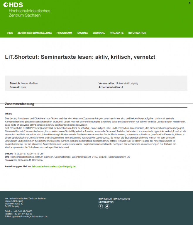 Am 19. Juni wurde SHRIMP im Rahmen eines LiT.Shortcut interessierten Lehrenden vorgestellt. Unter dem Titel "LiT.Shortcut: Seminartexte lesen: aktiv, kritisch, vernetzt" informierten sich die 12 Teilnehmenden des Kurzworkshops über das Projekt und diskutierten gemeinsam die Rolle des kritischen Lesens in ihren jeweiligen Fächern, die Potenziale von Social Hypertext und die Lehr-Lern-Szenarien, die sich bei einer Nutzung dieses Mediums ergeben.