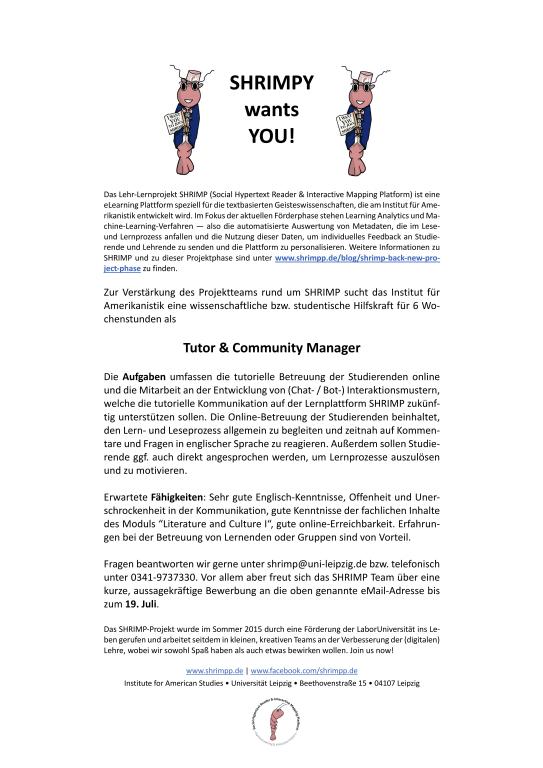 SHRIMP sucht nach noch mehr Verstärkung für unser Team. Für das kommende Wintersemester 2019/2020 und die neue Projektphase von SHRIMP suchen wir einen neuen Tutor / Community Manager mit guten Kentnissen der Inhalte von LC I. Die Bewerbungsfrist ist der 19. Juli.